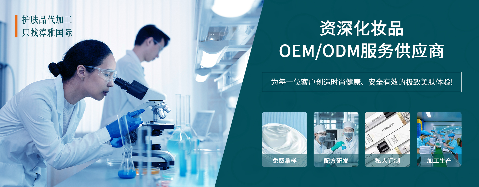 淳雅国际拥有一支高水准、高素质的专业团队,以商业战略为驱动力,以产品优势与设计策划为锋芒,携手众多企业驰骋商海,并肩前行,全心全意为 OEM/ODM 合作伙伴提供整体解决方案,现已成为一家集原料供应、配方研发、加工生产及配套性服务为一体的专业承接品牌OEM/ODM 的大型现代化综合性化妆品企业。
